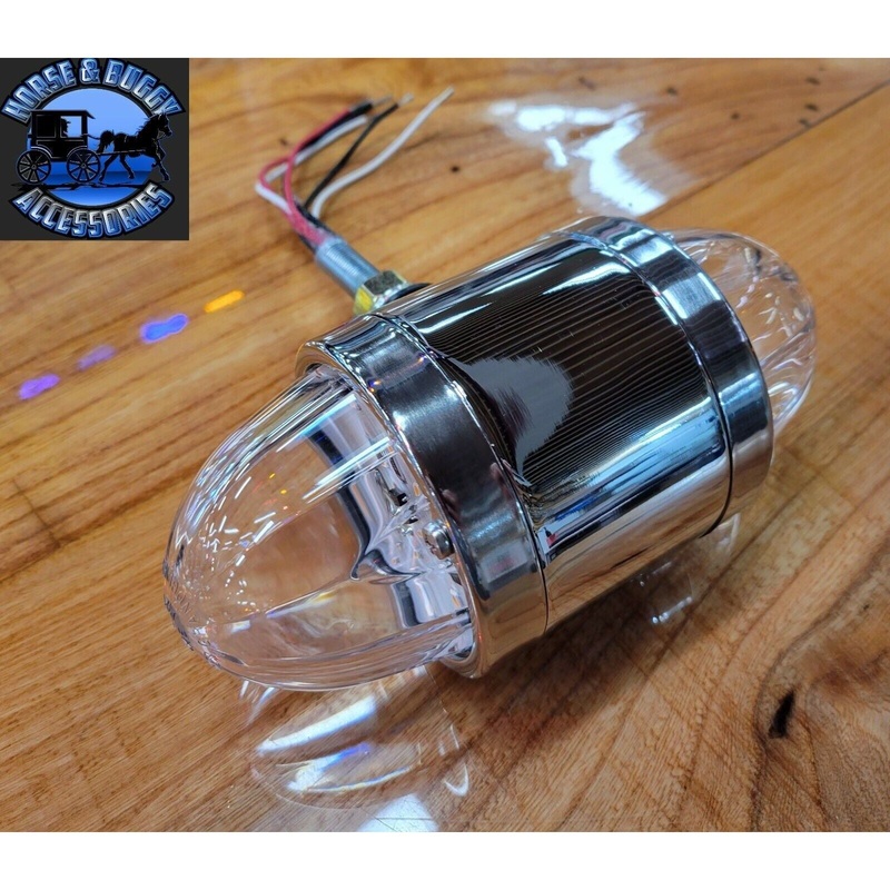 Bulbled 18 diode on each sideSize3-1/2" dia. x 7-1/2" (W) s 5-1/2" (H) Stud: 20 thread, 1/2" dia., 1-11/16" longMaterialChrome die cast housing and plastic lens stainless steel bezelWire Connection3 wires, 18 Gaugered-high functionblack-low functionwhite-g