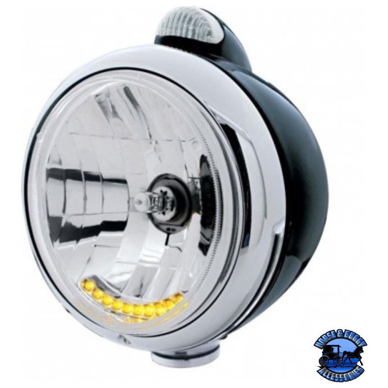 Gloss black powder coated steel headlight housing with matching top mount cover and beautiful chrome plated bezel.Fully assembled with crystal halogen headlight bulb with amber LED accent lights, item # S2010LED.Includes top mounted dual function signal li
