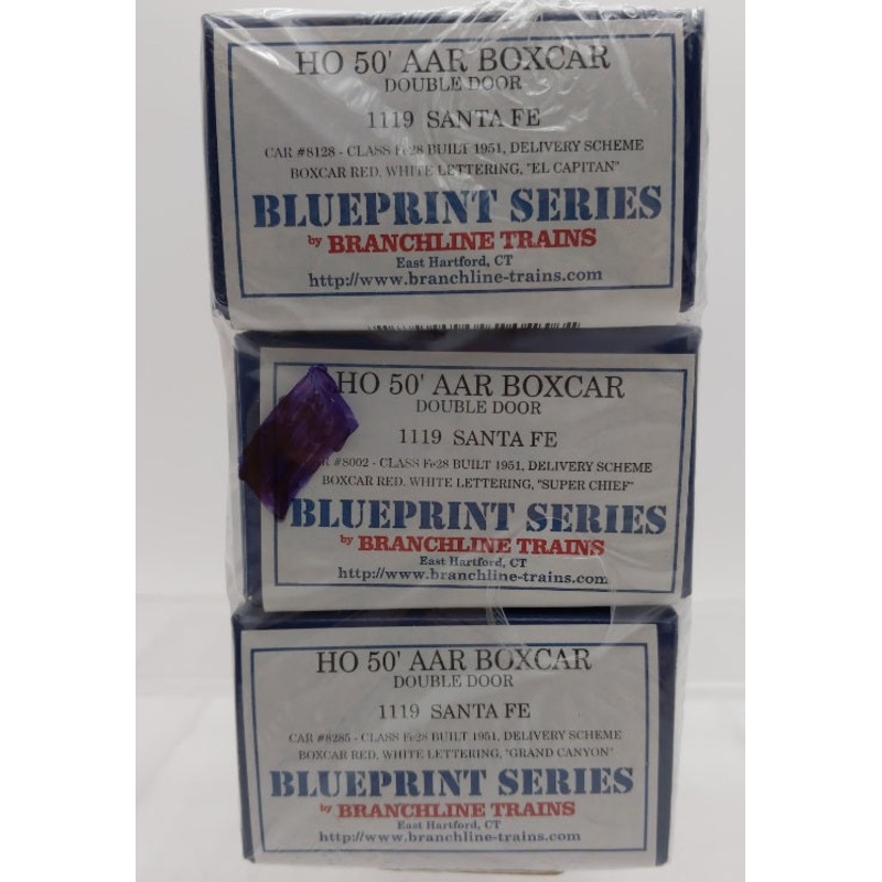 This is a Branchline Trains 1119 HO Santa Fe 50' AAR Double Door Boxcar Kit (Set of 3).Blueprint Series. Boxcars Numbers and Lettering: 8128 "El Capitan" / "Super Chief" 8002 & "Frand Canyon" 8285.Condition: Factory New (C-9)Operational Status: FunctionalO
