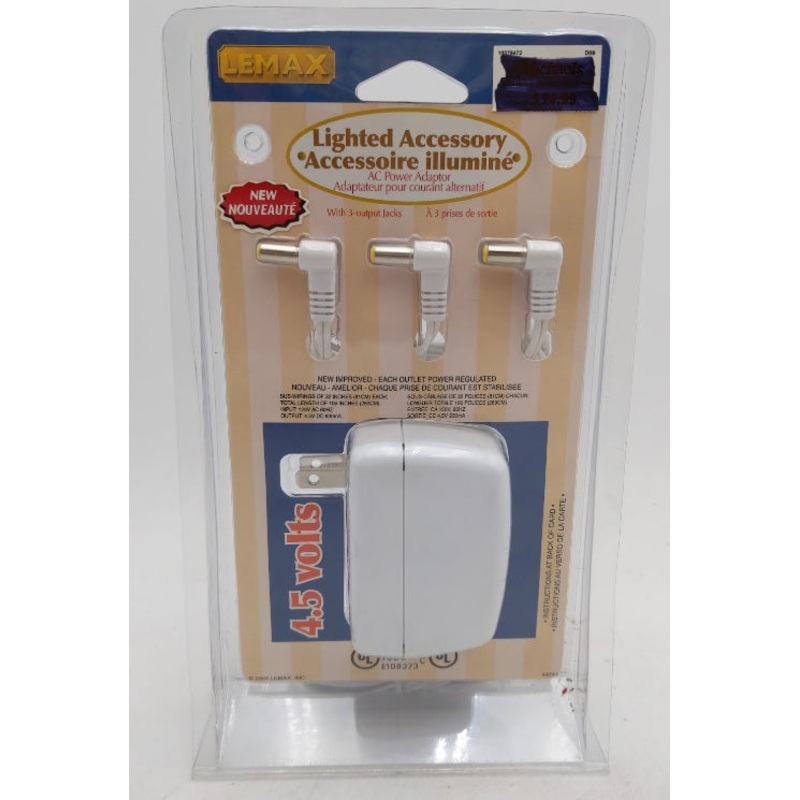 Here is a Lemax 44241 4.5V AC Power Adaptor with 3 Outputs. Features include each outlet power regulated, input 120V AC 60HZ, output 4.5V DC 930mA.Condition: Factory NewOperational Status: FunctionalOriginal Box: YesManufacturer: LemaxModel Number: 44241MS
