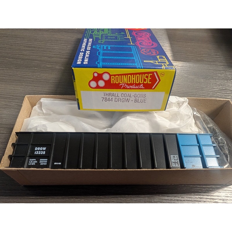 This is a Roundhouse 7844 HO Scale Blue D&RGW Thrall Coal-Gondola #13338 Kit.Condition: Factory New (C-9)Operational Status: FunctionalOriginal Box: Yes (P-9)Manufacturer: RoundhouseModel Number: 7844MSRP: $14.99Scale/Era: HO ScaleModel Type: Freight CarsT